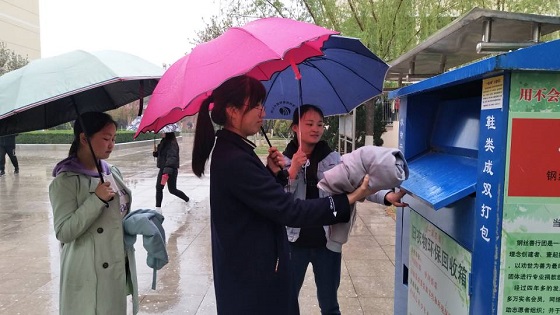 为了给贫困地区的孩子们献出一份爱心,发扬志愿服务精神,4月11日,我院于2号宿舍楼广场举办“衣+衣=爱”主题捐衣活动。本次活动由学生代表刘荣庆主持,18级部分学生参加。