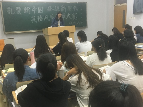 此次活动以“礼赞新中国,奋进新时代”为主题。活动前期各班利用微信班级群告知活动时间及流程安排,活动采取学生自主报名和同学推荐两种参加方式,参赛选手以“How Marvelous,My China”为主题进行英文演讲,学生代表关文雅的演讲中提到,少年兴则国兴,少年强则国强,作为当代的大学生的同学们是建设祖国的强大力量,倡议同学们要努力学习先进的科学文化知识,报效祖国。此后,参赛选手表演自己准备的与英语相关的才艺表演。最终,徐赫获得一等奖,将参与学校决赛。