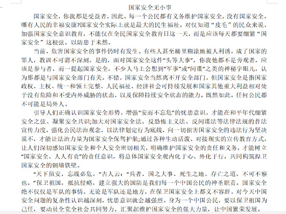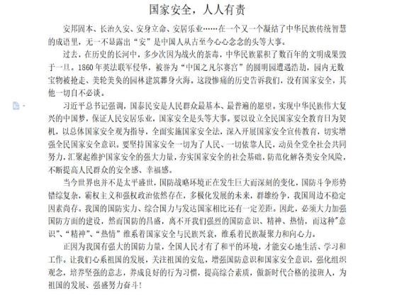 本次活动响应国家在四月份进行的国家安全知识教育,以国家安全为主题进行征文活动。对于此次活动同学们积极响应,踊跃参加,通过征文表达出对国家安全的认识及感想。其中,李凯丽同学的征文着重介绍了国家安全的定义,周菲菲同学的征文则进行了优美的图文排版,以新颖的方式展现了新冠疫情下的国家安全。此次活动涌现出许多优秀作品,周菲菲获得一等奖,贾丽萍获得二等奖,郭洪双等人获得三等奖,本次活动取得了圆满成功。