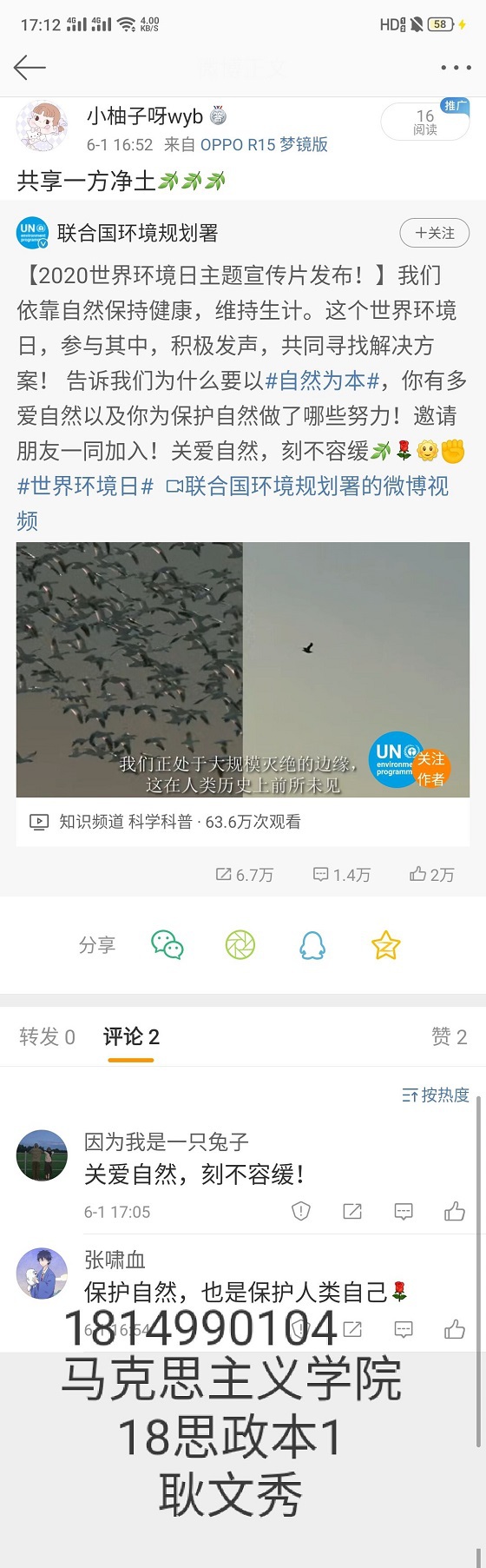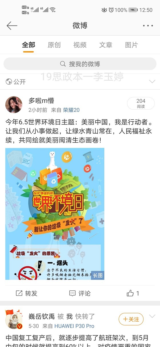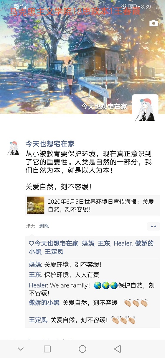 习近平主席曾说:“环境就是民生,青山就是美丽,蓝天也是幸福。”保护环境是我们每个人的责任。活动准备前期,同学们踊跃报名,充分准备。同学们在自己的网络社交圈发表与宣传世界环境日有关的视频、海报图片、文字素材等,帮助身边人了解保护环境的重要性,呼吁身边人以实际行动保护我们的大自然。经过一段时间的宣传,同学们以截图和录屏的方式进行记录自己在保护环境过程中的点滴,并表达自己的感想,其中,曲媛媛同学感触颇深,她认为“发展经济不应该以牺牲环境为代价”,应该从维护国家生态安全和可持续发展的大局出发,保护环境,获得了同学们的一致认同,本次活动在同学们的积极参与下圆满结束。