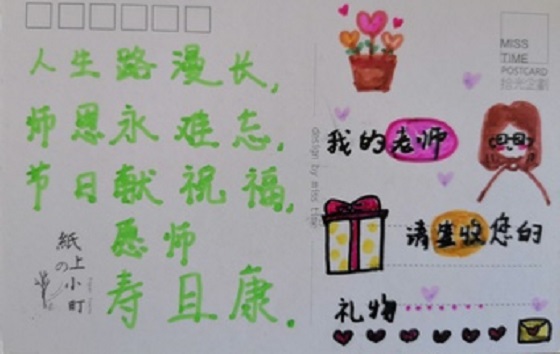 活动伊始,学生们大胆发挥想象力,将自己对老师的真情实感书写在贺卡上。其中,学生代表周升瑜写道:人生路漫长,师恩永难忘,节日献祝福,愿师寿且长”。同时学生会也为老师们准备花束,充分表达了对老师的真挚的祝福。此次活动圆满结束。