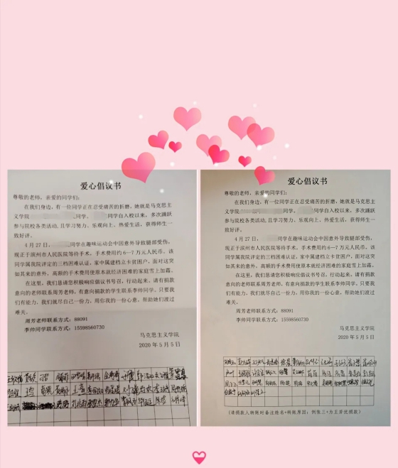 我院同学在运动会中意外受伤,由于这名同学家庭较为困难,我院学生会成员结合实际向全院学生发布爱心倡议书,经过学生会爱心募捐,为我院困难同学征集捐款3467元,给予这个家庭经济上的帮助和精神上的支持,让他们感受到了同学们的关心与爱护。