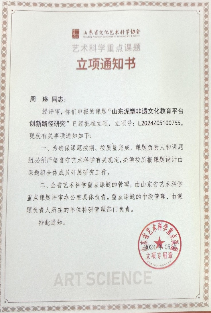 2024年度山东省艺术科学重点课题立项名单》已公布,我院周琳副教授的《山东泥塑非遗文化教育平台创新路径研究》和刘川博士《虚拟艺术本体论错位的现象学研究》获准立项。